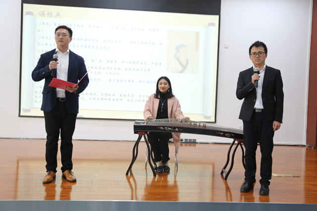 在誦經(jīng)典環(huán)節(jié),整車出口事業(yè)部售后服務(wù)分部武向東、田江、姚瑤誦讀講解《論語·顏淵》)。